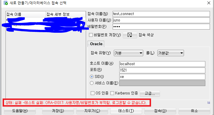 먼저 새 접속을 통해 새로운 계정을 만들어보자. 나는 사용자 이름으로 'dongeranguk' 과 비밀번호를 '1234'로 설정하였다.하지만, 접속버튼을 누르면 다음과 같은 오류메시지가 발생한다.'invalid userna