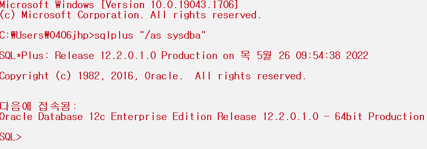 입력을 하게 되면 이런식으로 cmd에서 SQL>이 뜨면서 접속이 된 것을 확인할 수 있습니다.