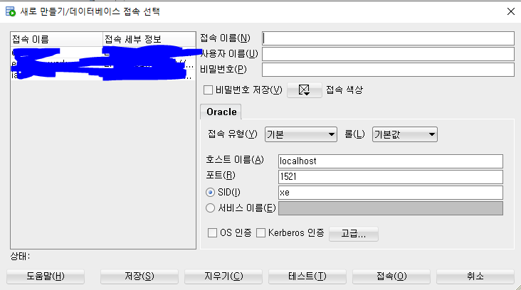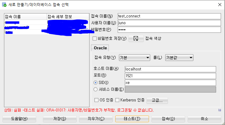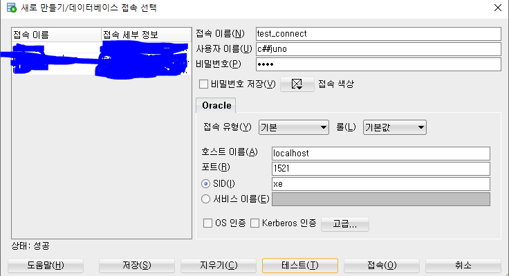 새 접속을 클릭하게 되고, 접속 이름, 사용자 이름, 비밀번호를 입력한 뒤, 테스트를 클릭해봅시다.