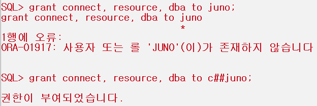 'juno' 계정에 dba 권한을 부여해보도록 하겠습니다.